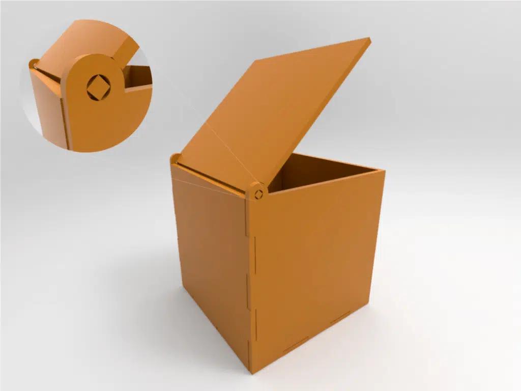 Las cajas más básicas tienen este tipo de bisagras en corte láser CNC, basta con que traces una perforación en las paredes laterales (del mismo tamaño que el grosor de tu material) y en la tapa añadir un eje de giro, considera también que la cara trasera debe contar con la tolerancia suficiente para que la tapa superior pueda abrirse y cerrarse con facilidad.