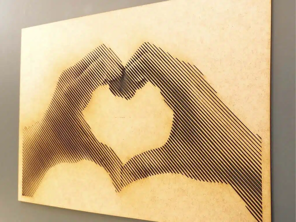 5. Exporta el archivo e impórtalo en el controlador de tu máquina para realizar el corte, una vez finalizada la operación basta con colocar un material de color contrastante en la parte inferior de la pieza cortada para generar la ilusión óptica de la escala de grises.