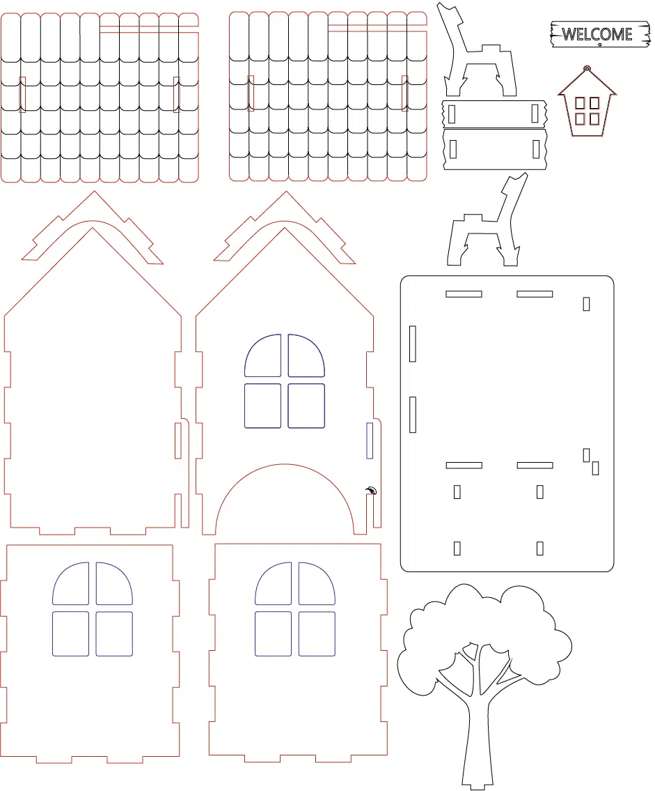 Te compartimos un vector descargable para crear el diseño de una casa de un piso, con banca para exterior y letrero de «Welcome».