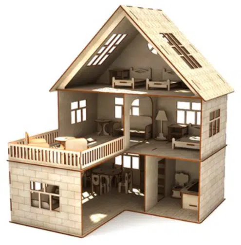 Te compartimos un vector descargable para reproducir el diseño de una casa de muñecas de tres niveles, con terraza.