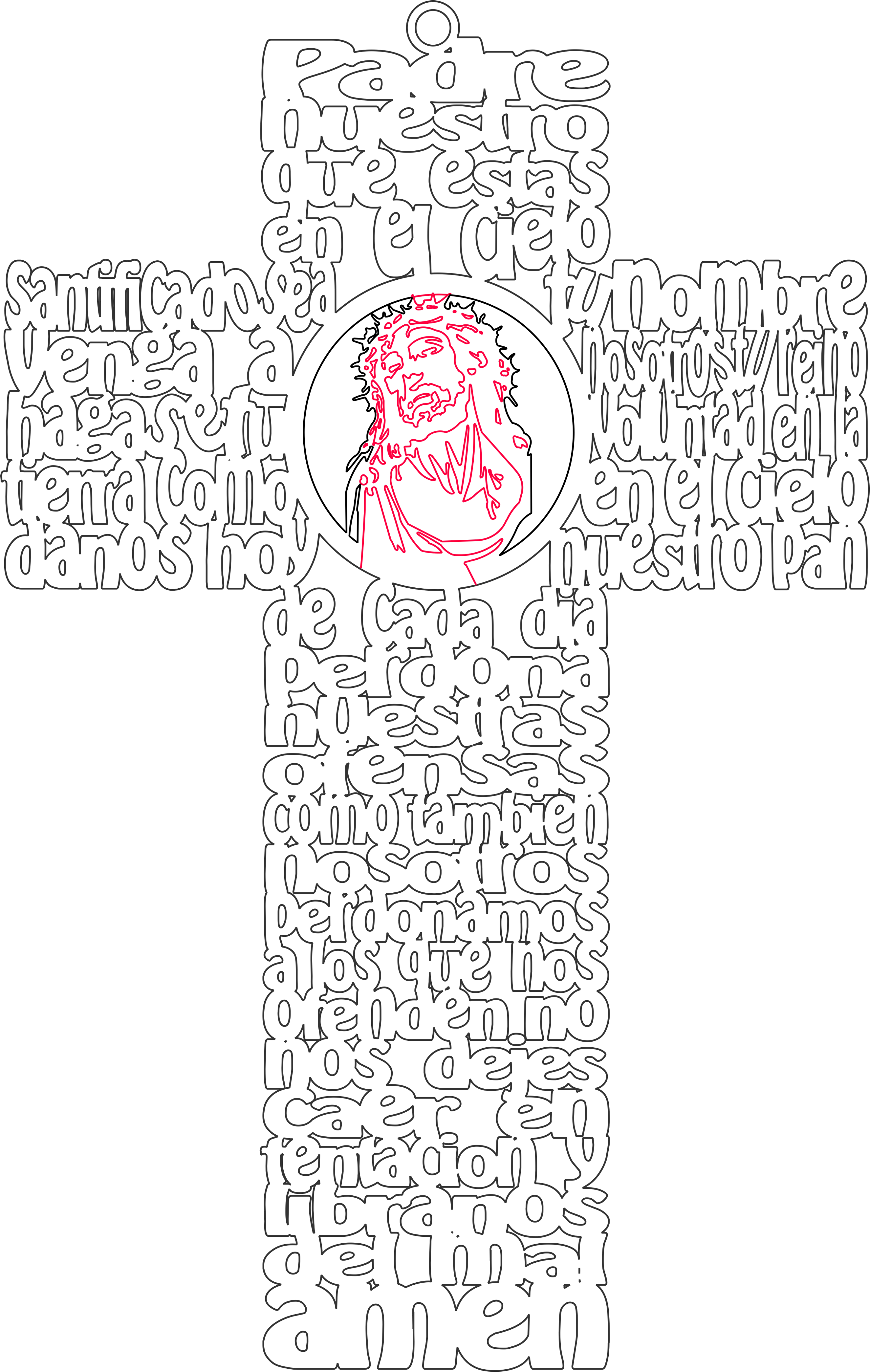 Te compartimos un vector descargable para reproducir una cruz con la oración del Padre Nuestro y la imagen de Cristo con corona de espinas en el centro.