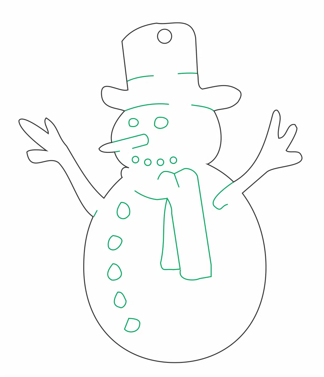 Te compartimos un vector descargable para reproducir un adorno navideño, colgante, con forma de muñeco de nieve.