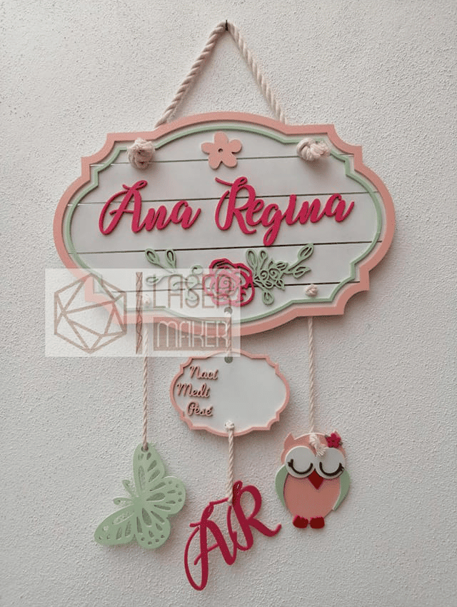 Te compartimos un vector descargable para reproducir el diseño de un letrero de bienvenida para un niña recién nacida. Con colgantes decorativos de búho, para poner los datos de nacimiento.