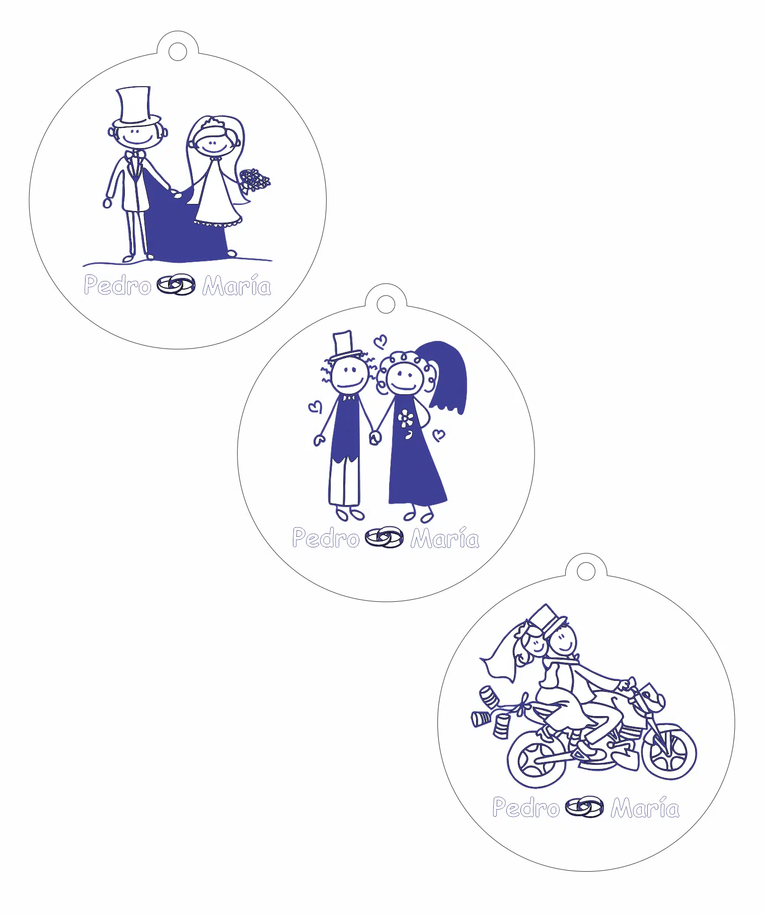 Te compartimos un vector descargable para reproducir 3 diseños diferentes de llaveros alusivos al matrimonio.
