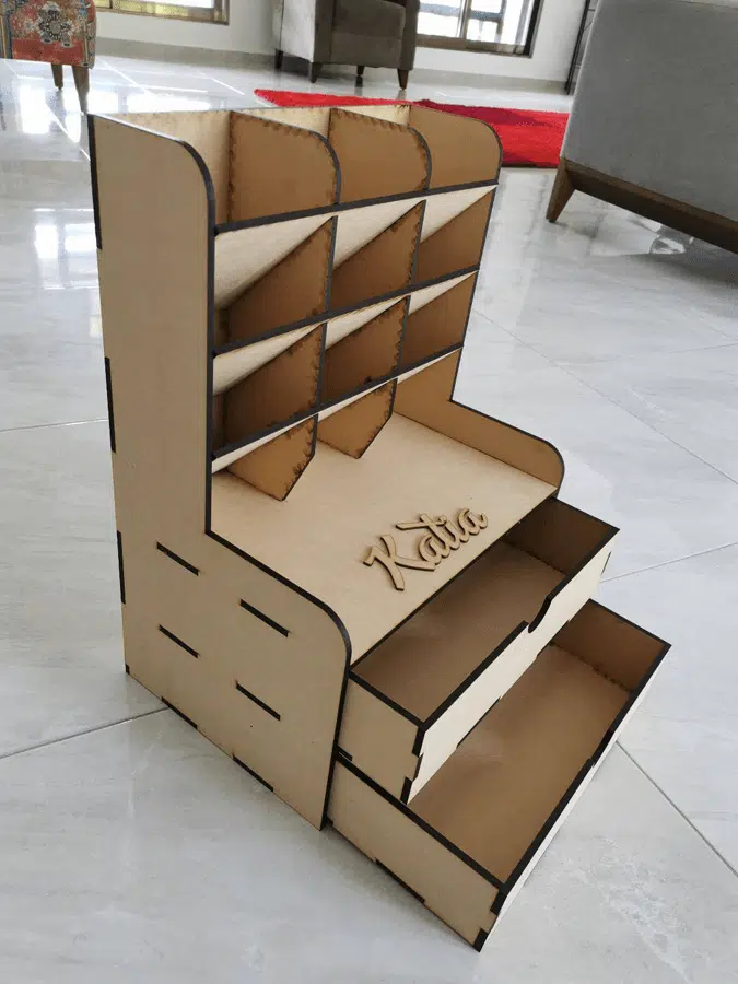 Te compartimos un vector descargable para reproducir el modelo de un organizador de escritorio, con dos cajones y 9 espacios para colores, plumas o plumones.