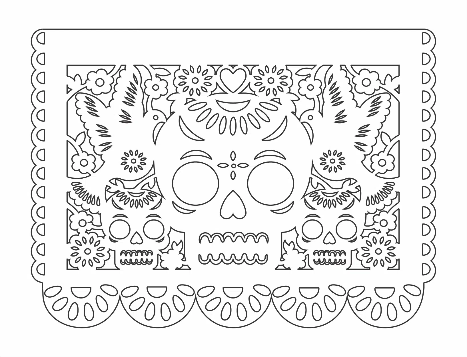 Te compartimos un vector descargable para reproducir un diseño de papel picado, decorado con calaveras y palomas.