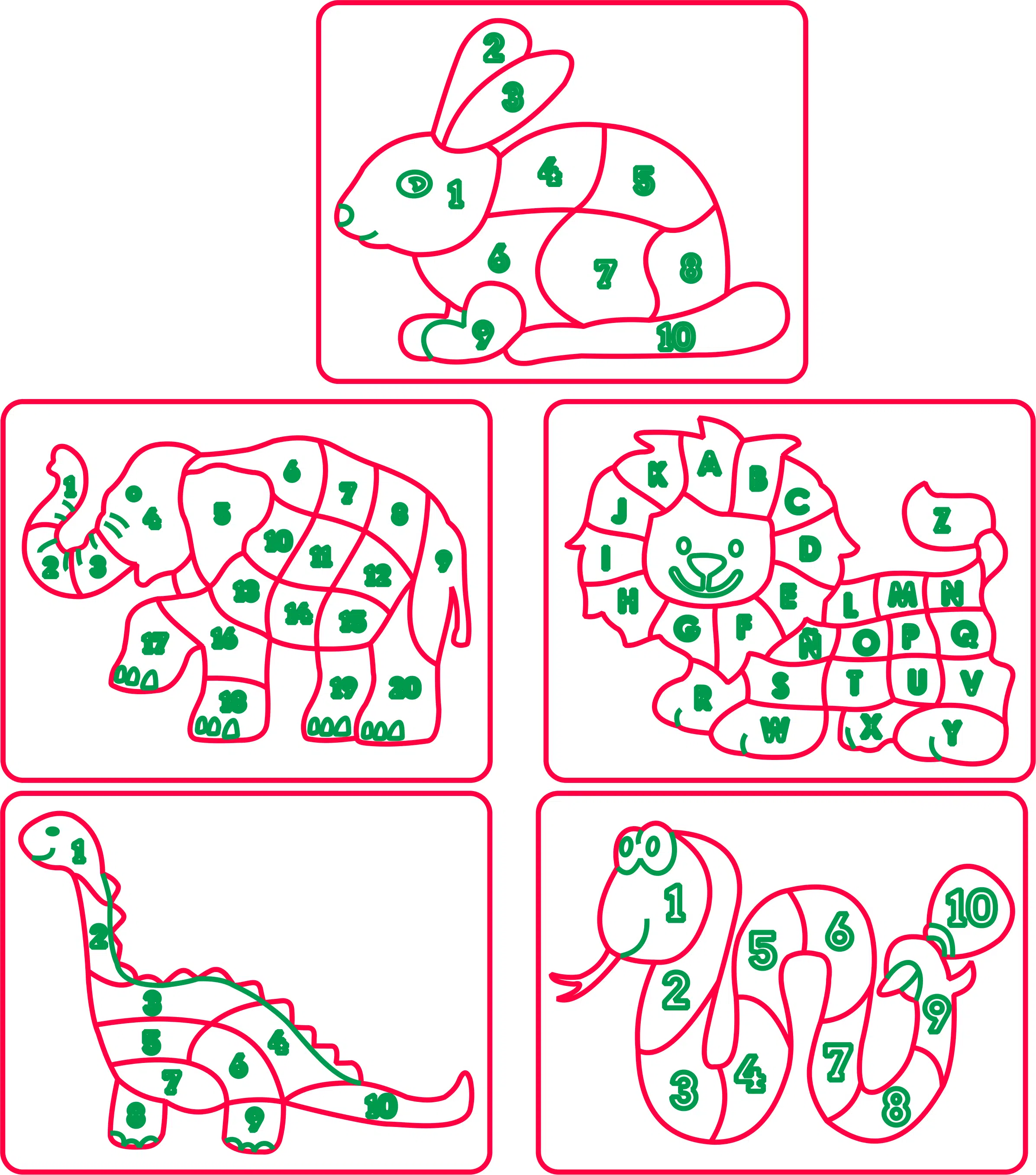 Te compartimos un vector descargable para crear 5 diseños diferentes de rompecabezas de animales: conejo, elefante, león, dinosaurio y serpiente.