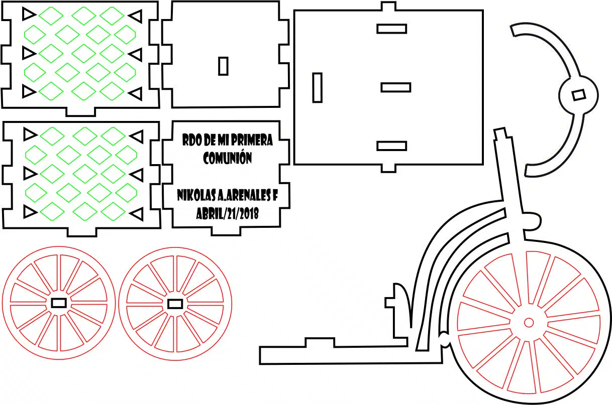 Te compartimos un vector descargable para reproducir un elemento decorativo con forma de triciclo, grabado con la frase «Mi Primera Comunión».
